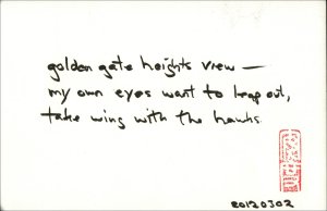 golden gate heights view — my own eyes want to leap out, take wing with the hawks. Share this: Email a link to a friend (Opens in new window) Email Share on X (Opens in new window) X Share on Facebook (Opens in new window) Facebook Share on Reddit (Opens in new window) Reddit Share on Pinterest (Opens in new window) Pinterest Share on Tumblr (Opens in new window) Tumblr Share on Facebook (Opens in new window) Facebook Like Loading... Related Published by haikuandy Aspiring human being. View all posts by haikuandy