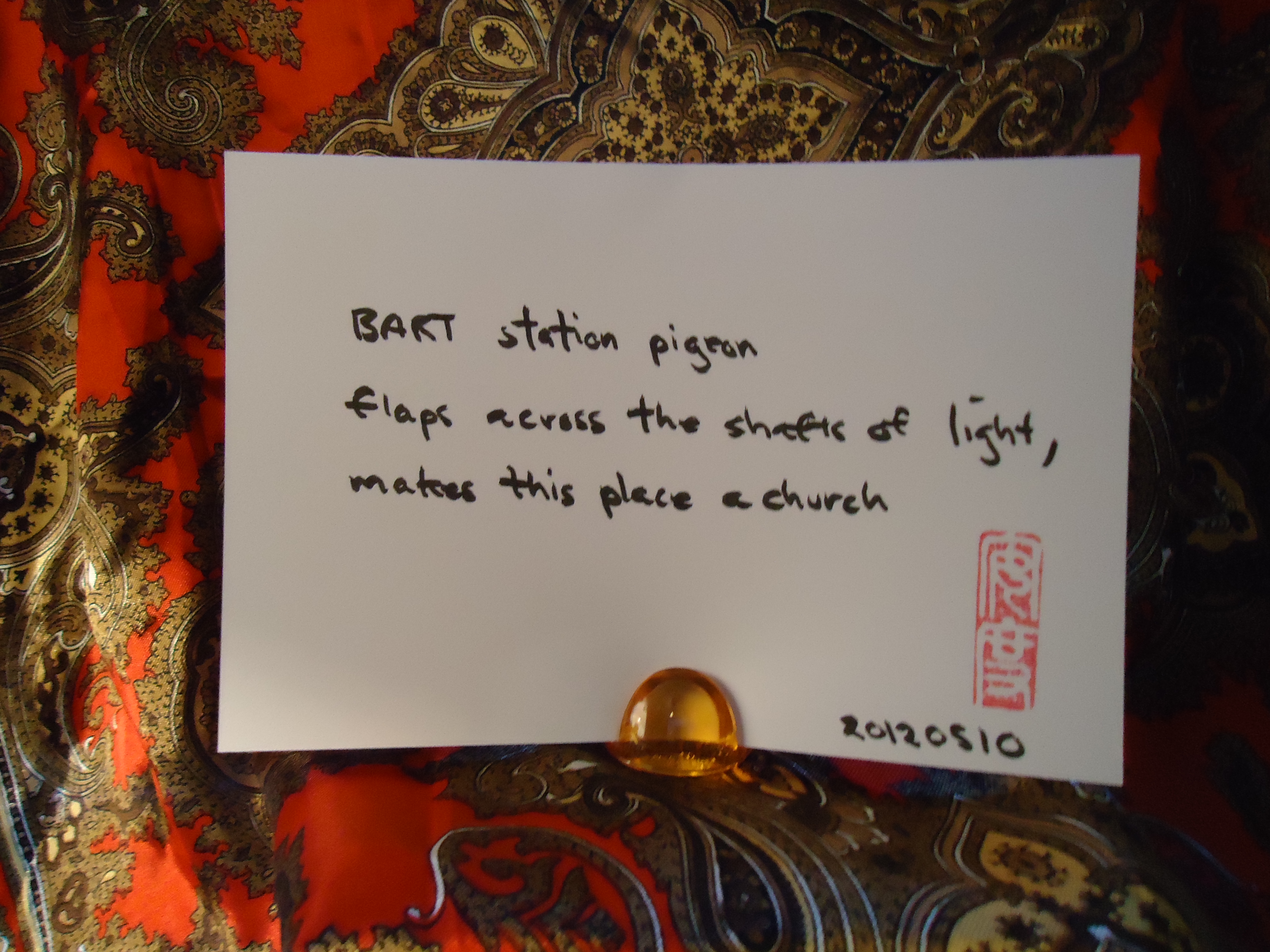 BART station pigeon flaps across the shafts of light, makes this place a church Share this: Email a link to a friend (Opens in new window) Email Share on X (Opens in new window) X Share on Facebook (Opens in new window) Facebook Share on Reddit (Opens in new window) Reddit Share on Pinterest (Opens in new window) Pinterest Share on Tumblr (Opens in new window) Tumblr Share on Facebook (Opens in new window) Facebook Like Loading... Related Published by haikuandy Aspiring human being. View all posts by haikuandy