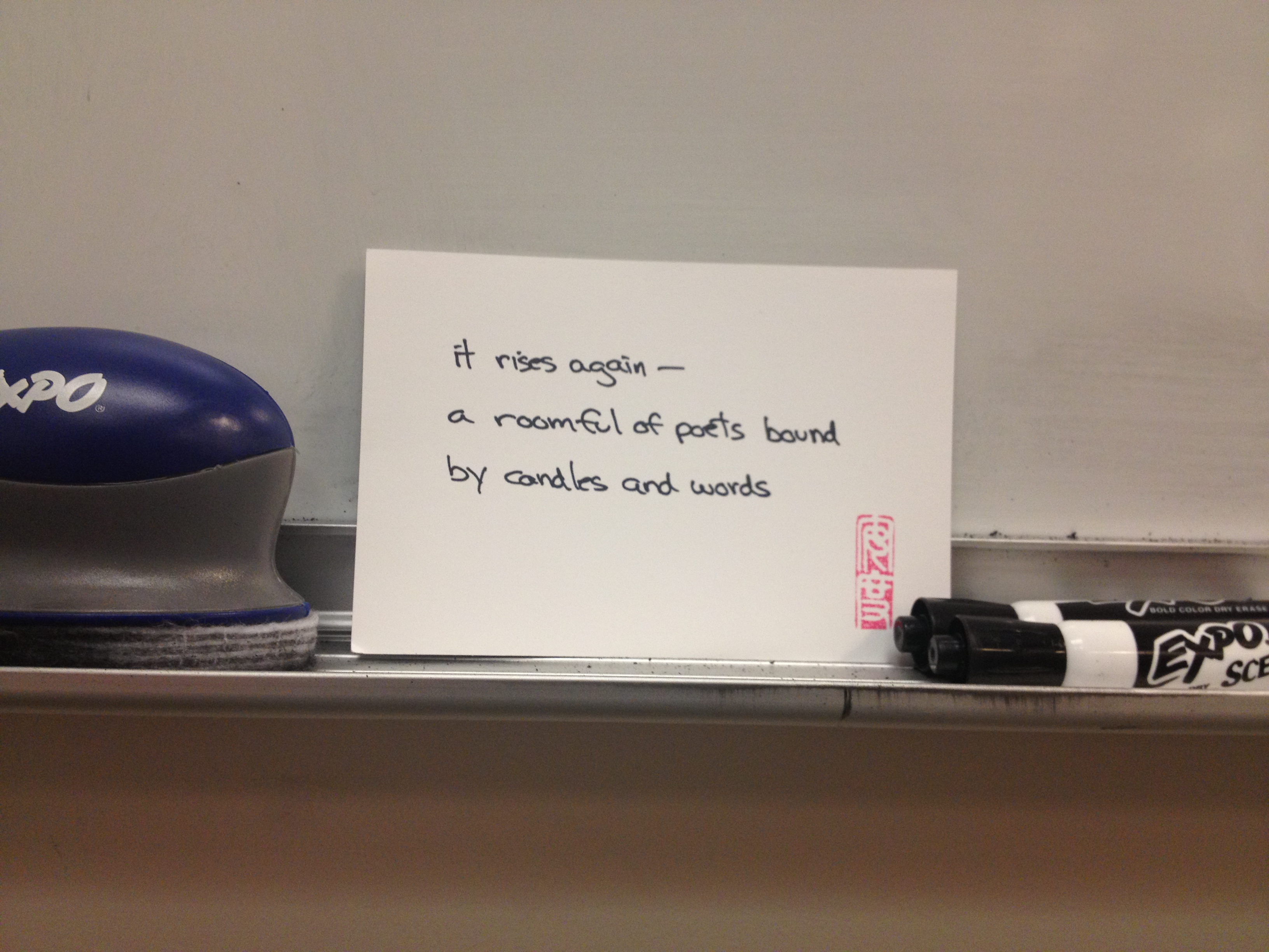 A mutual friend thought you might appreciate a haiku in the mail. Your name was put in a hat and eventually selected at random. For more about this project, click the tab above “Daily Haiku Actual Postcard.”