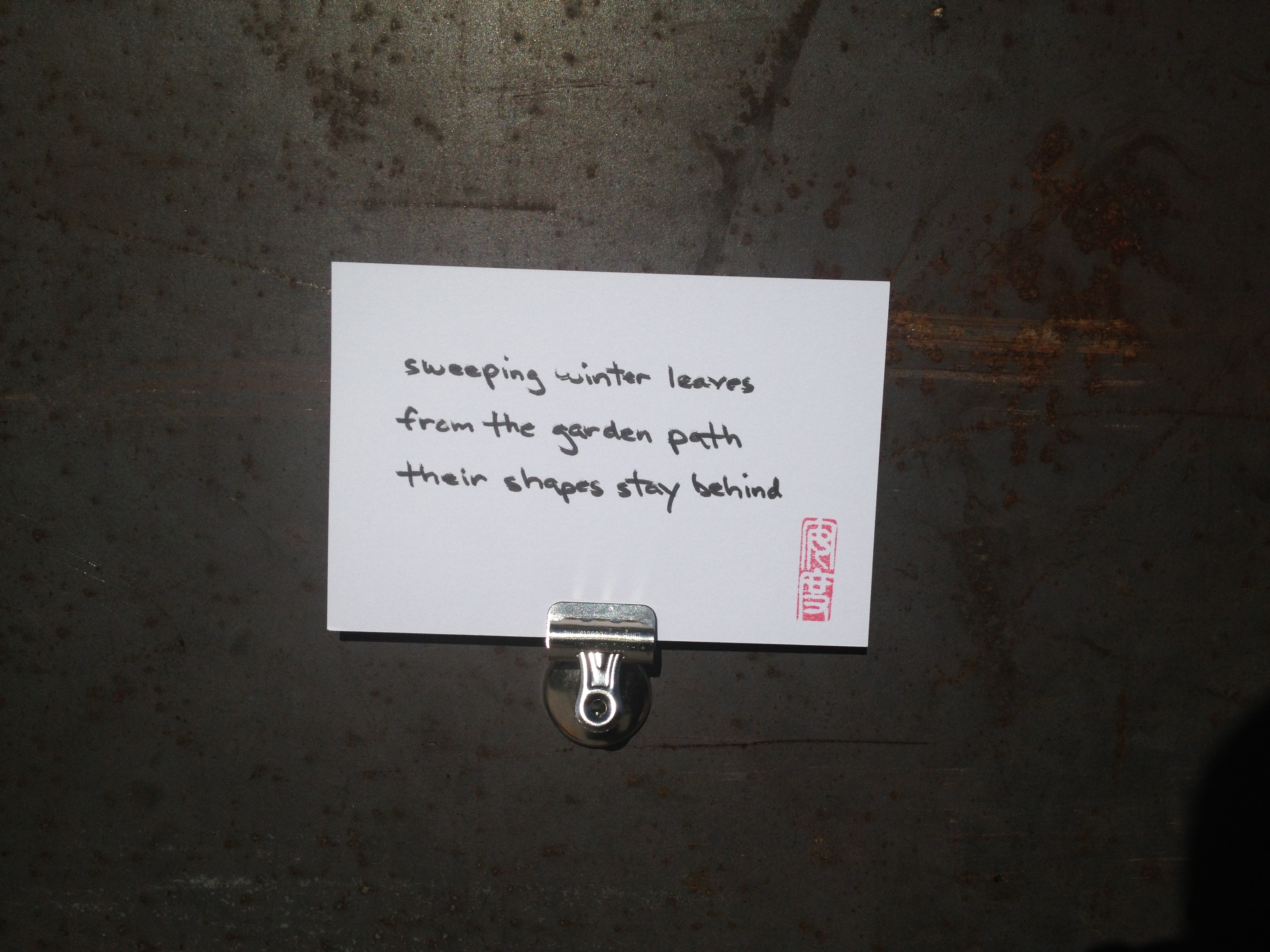 sweeping winter leaves from the garden path — their shapes stay behind Share this: Email a link to a friend (Opens in new window) Email Share on X (Opens in new window) X Share on Facebook (Opens in new window) Facebook Share on Reddit (Opens in new window) Reddit Share on Pinterest (Opens in new window) Pinterest Share on Tumblr (Opens in new window) Tumblr Share on Facebook (Opens in new window) Facebook Like Loading... Related Published by haikuandy Aspiring human being. View all posts by haikuandy