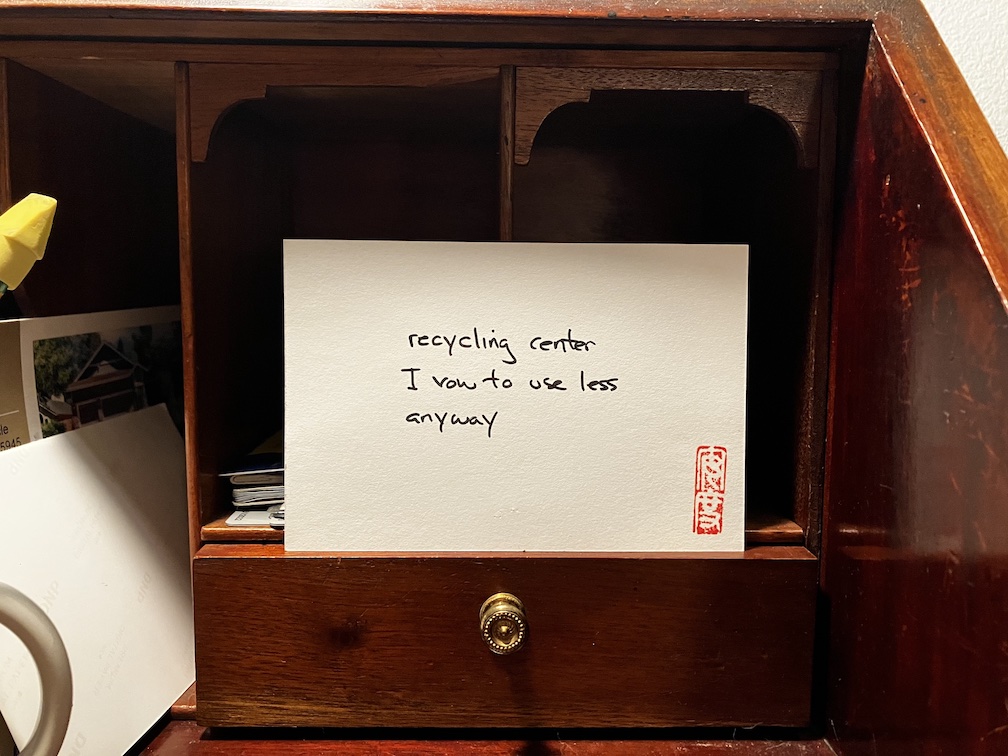 recycling centerI vow to use lessanyway Like my haiku? Buy me a coffee! Share this: Click to email a link to a friend (Opens in new window) Email Click to share on X (Opens in new window) X Click to share on Facebook (Opens in new window) Facebook Click to share on Reddit (Opens in new window) Reddit Click to share on Pinterest (Opens in new window) Pinterest Click to share on Tumblr (Opens in new window) Tumblr Click to share on Facebook (Opens in new window) Facebook Like Loading... Related Published by haikuandy Aspiring human being. View all posts by haikuandy