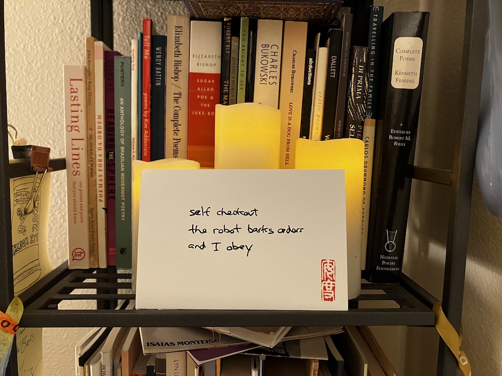 self checkoutthe robot barks ordersand I obey Like my haiku? Buy me a coffee! Share this: Click to email a link to a friend (Opens in new window) Email Click to share on X (Opens in new window) X Click to share on Facebook (Opens in new window) Facebook Click to share on Reddit (Opens in new window) Reddit Click to share on Pinterest (Opens in new window) Pinterest Click to share on Tumblr (Opens in new window) Tumblr Click to share on Facebook (Opens in new window) Facebook Like Loading... Related Published by haikuandy Aspiring human being. View all posts by haikuandy