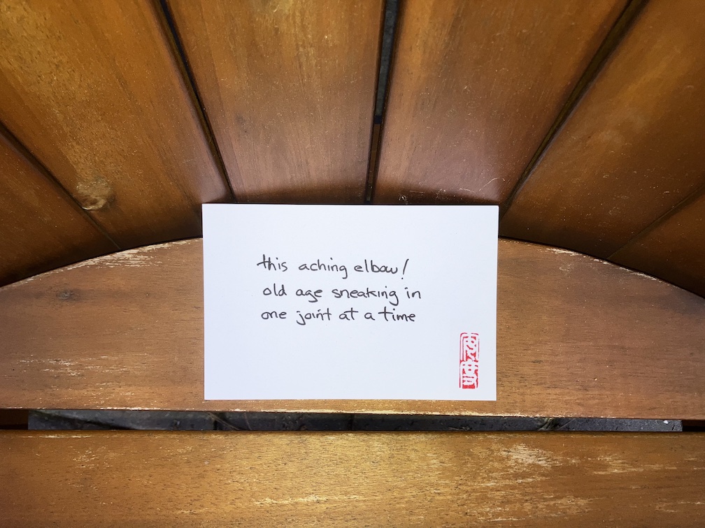 this aching elbow!old age sneaking inone joint at a time Like my haiku? Buy me a coffee Share this: Click to email a link to a friend (Opens in new window) Email Click to share on X (Opens in new window) X Click to share on Facebook (Opens in new window) Facebook Click to share on Reddit (Opens in new window) Reddit Click to share on Pinterest (Opens in new window) Pinterest Click to share on Tumblr (Opens in new window) Tumblr Click to share on Facebook (Opens in new window) Facebook Like Loading... Related Published by haikuandy Aspiring human being. View all posts by haikuandy
