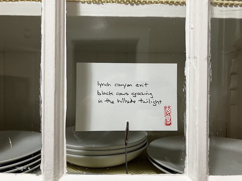 lynch canyon exitblack cows grazingin the hillside twilight Like my haiku? Buy me a coffee! Share this: Click to email a link to a friend (Opens in new window) Email Click to share on X (Opens in new window) X Click to share on Facebook (Opens in new window) Facebook Click to share on Reddit (Opens in new window) Reddit Click to share on Pinterest (Opens in new window) Pinterest Click to share on Tumblr (Opens in new window) Tumblr Click to share on Facebook (Opens in new window) Facebook Like Loading... Related Published by haikuandy Aspiring human being. View all posts by haikuandy