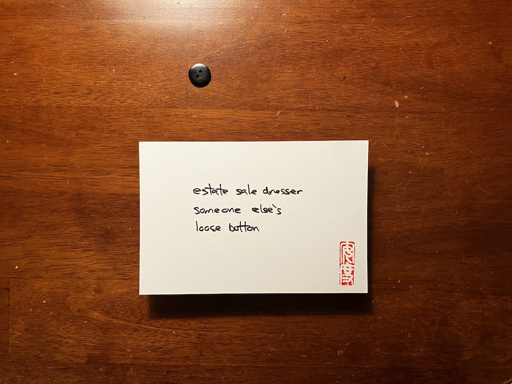 estate sale dressersomeone else’sloose button Like my haiku? Buy me a coffee Share this: Click to email a link to a friend (Opens in new window) Email Click to share on X (Opens in new window) X Click to share on Facebook (Opens in new window) Facebook Click to share on Reddit (Opens in new window) Reddit Click to share on Pinterest (Opens in new window) Pinterest Click to share on Tumblr (Opens in new window) Tumblr Click to share on Facebook (Opens in new window) Facebook Like Loading... Related Published by haikuandy Aspiring human being. View all posts by haikuandy