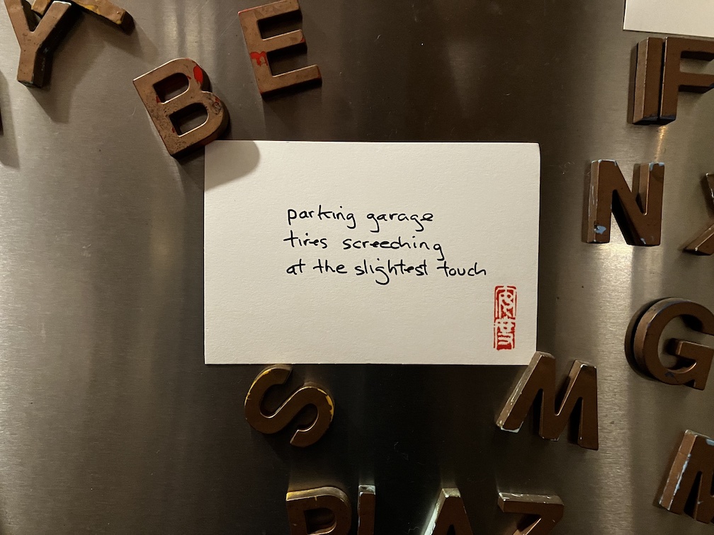 parking garagetires screechingat the slightest touch Like my haiku? Buy me a coffee Share this: Click to email a link to a friend (Opens in new window) Email Click to share on X (Opens in new window) X Click to share on Facebook (Opens in new window) Facebook Click to share on Reddit (Opens in new window) Reddit Click to share on Pinterest (Opens in new window) Pinterest Click to share on Tumblr (Opens in new window) Tumblr Click to share on Facebook (Opens in new window) Facebook Like Loading... Related Published by haikuandy Aspiring human being. View all posts by haikuandy