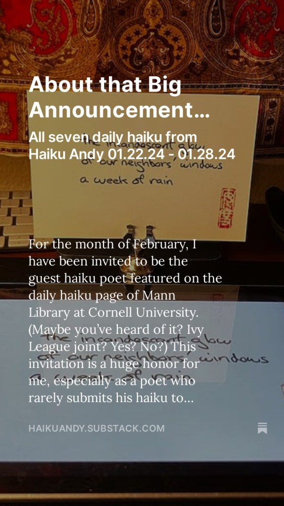 Every month, Cornell University’s Mann Library features a guest haiku poet for its Daily Haiku. I will be the guest poet for February. A huge honor for me. A real milestone in my haiku career.