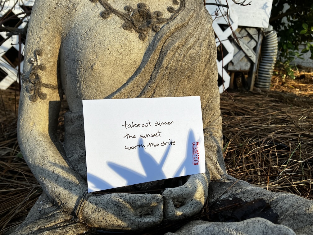 I almost never redo a haiku, but this morning I woke up and realized that yesterday’s fell short, and I had to re-do it. takeout dinnerthe sunsetworth the drive Share this: Click to email a link to a friend (Opens in new window) Email Click to share on X (Opens in new window) X Click to share on Facebook (Opens in new window) Facebook Click to share on Reddit (Opens in new window) Reddit Click to share on Pinterest (Opens in new window) Pinterest Click to share on Tumblr (Opens in new window) Tumblr Click to share on Facebook (Opens in new window) Facebook Like Loading... Related Published by haikuandy Aspiring human being. View all posts by haikuandy