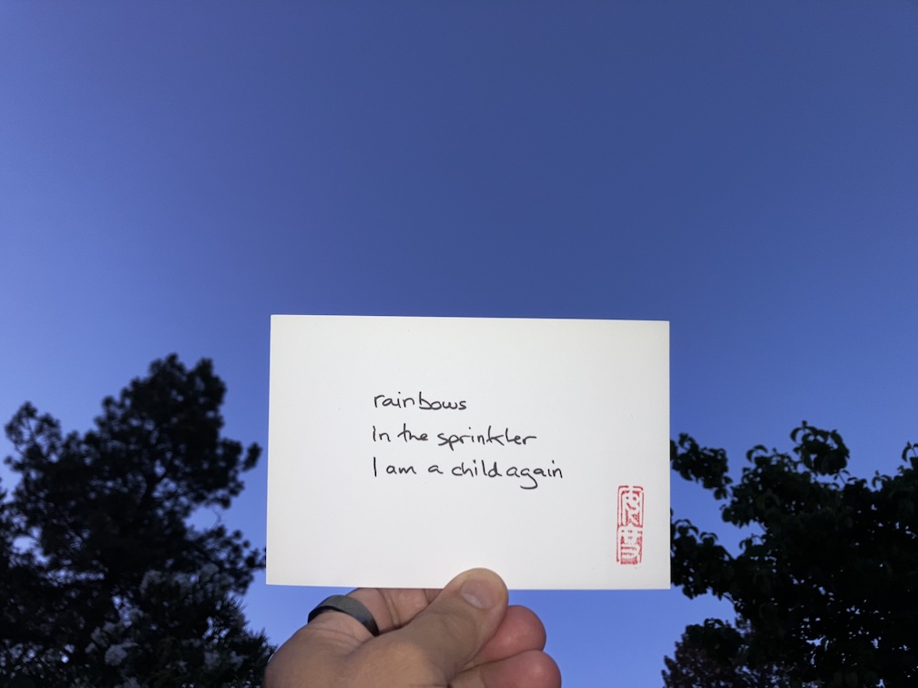 June 23, 2024 haikuandy haiga, haiku, micropoetry, minimalist poetry, poetry haiku 20240623 rainbowsin the sprinklerI am a child again
