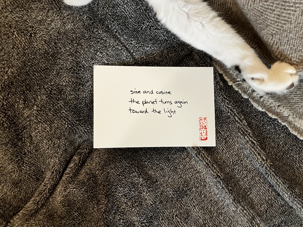 December 21, 2023 haikuandy haiku, micropoetry, poetry, postcard art haiku 20231221 sine and cosinethe planet turns againtoward the light
