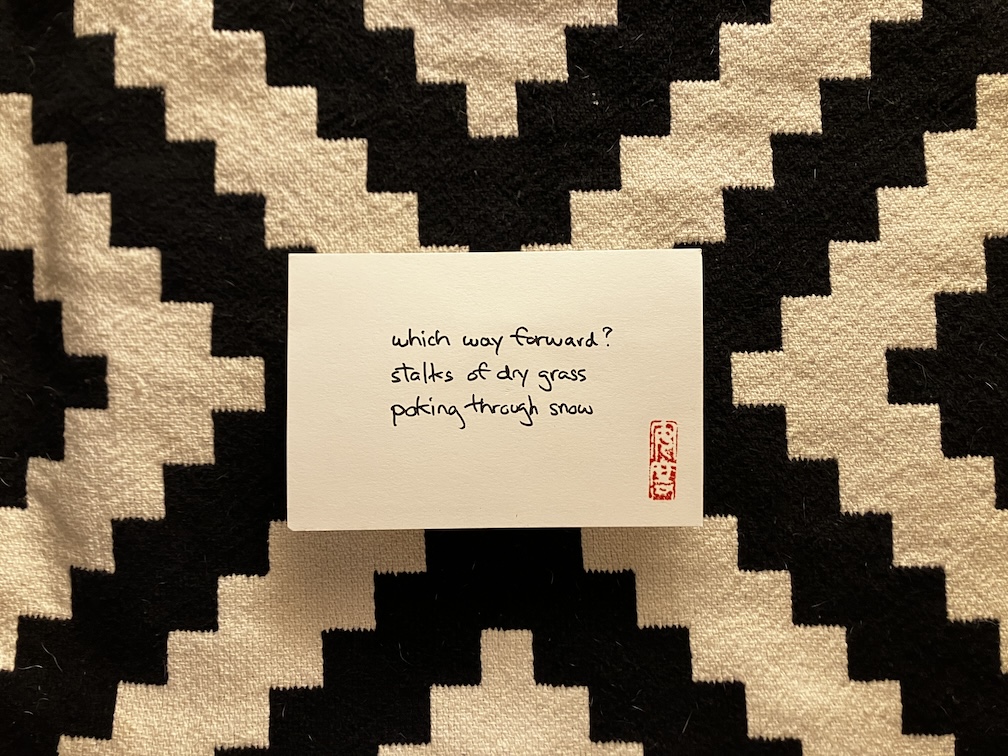 January 7, 2024 haikuandy haiga, haiku, micropoetry, poetry, postcard art haiku 20240107 which way forward?stalks of dry grasspoking through snow