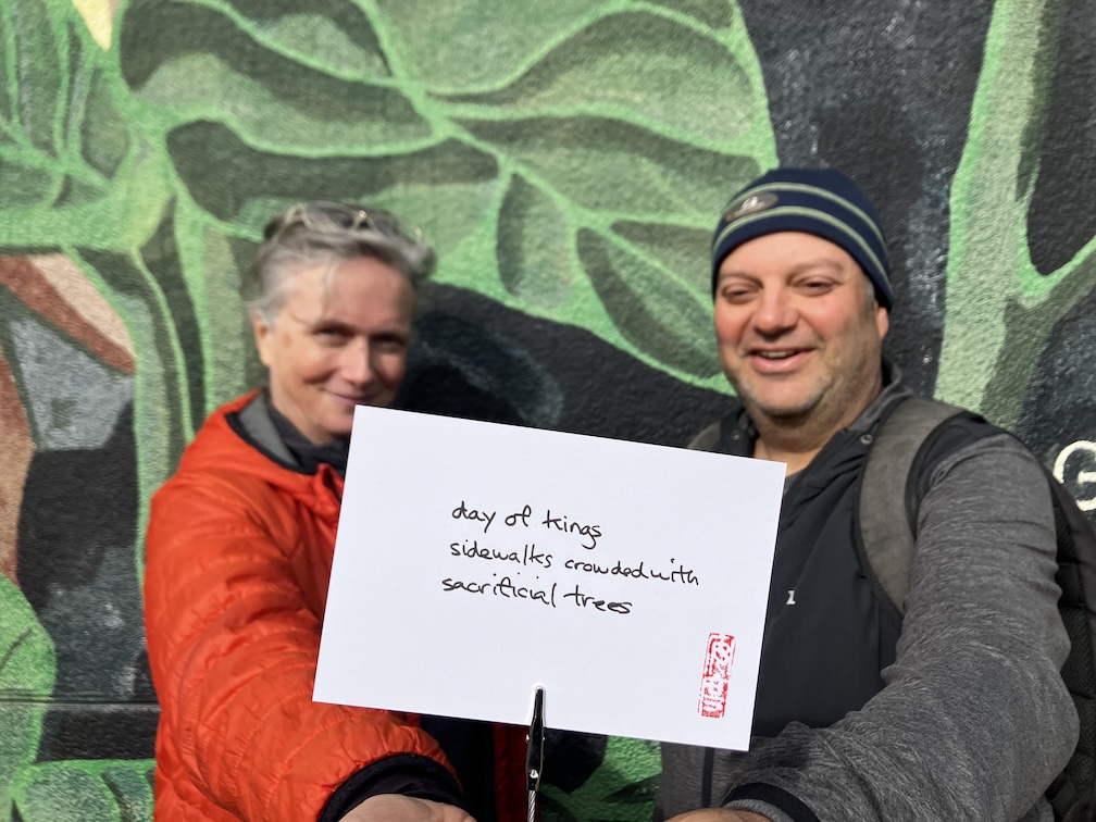 January 9, 2024 haikuandy haiku, micropoetry, poetry, postcard art haiku 20240109 day of kingssidewalks crowded withsacrifical trees