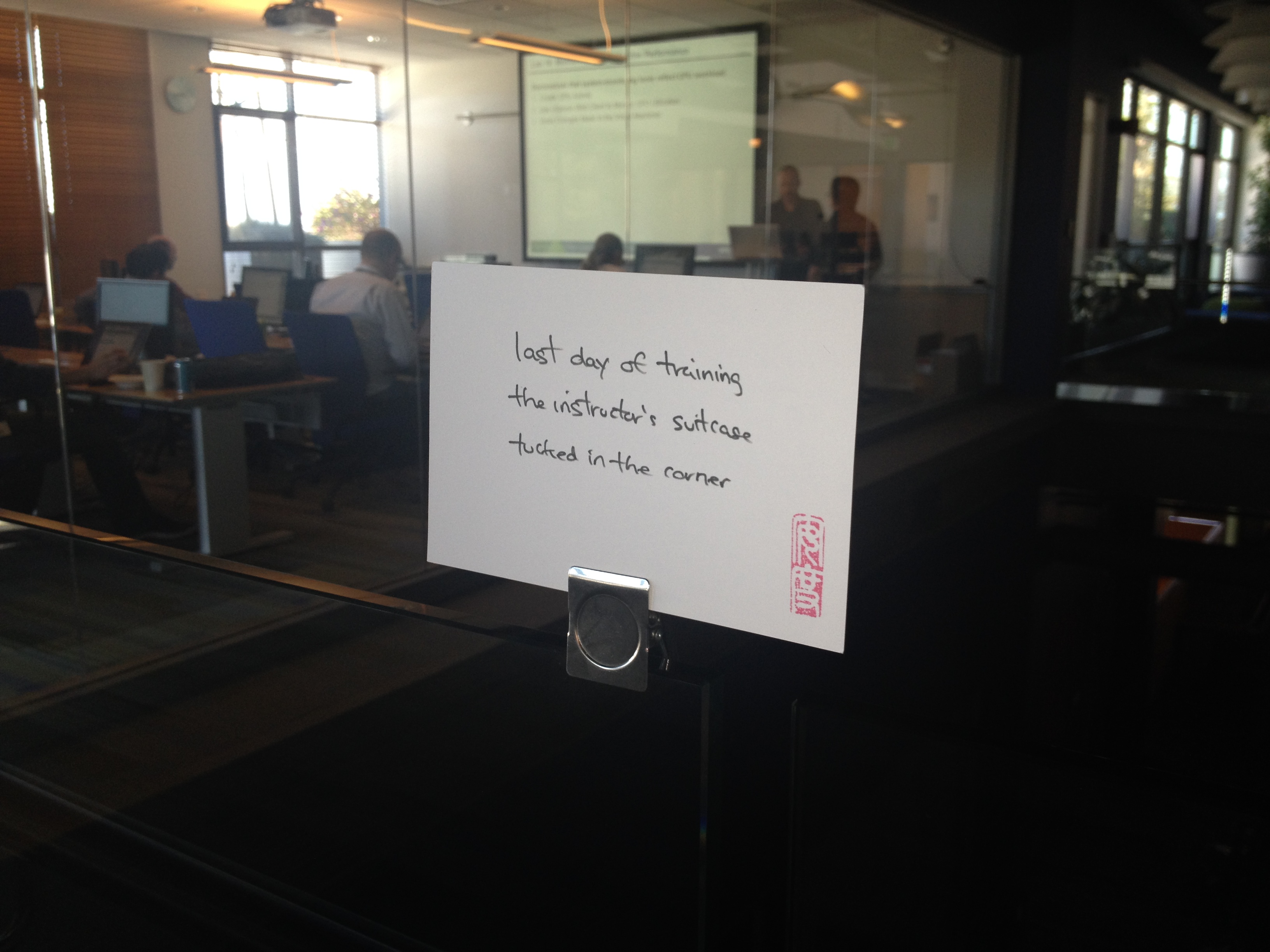 April 18, 2014April 17, 2014 haikuandy haiku, micropoetry, poetry, senryu, silicon valley haiku 20140418 last day of training the instructor’s suitcase tucked in the corner