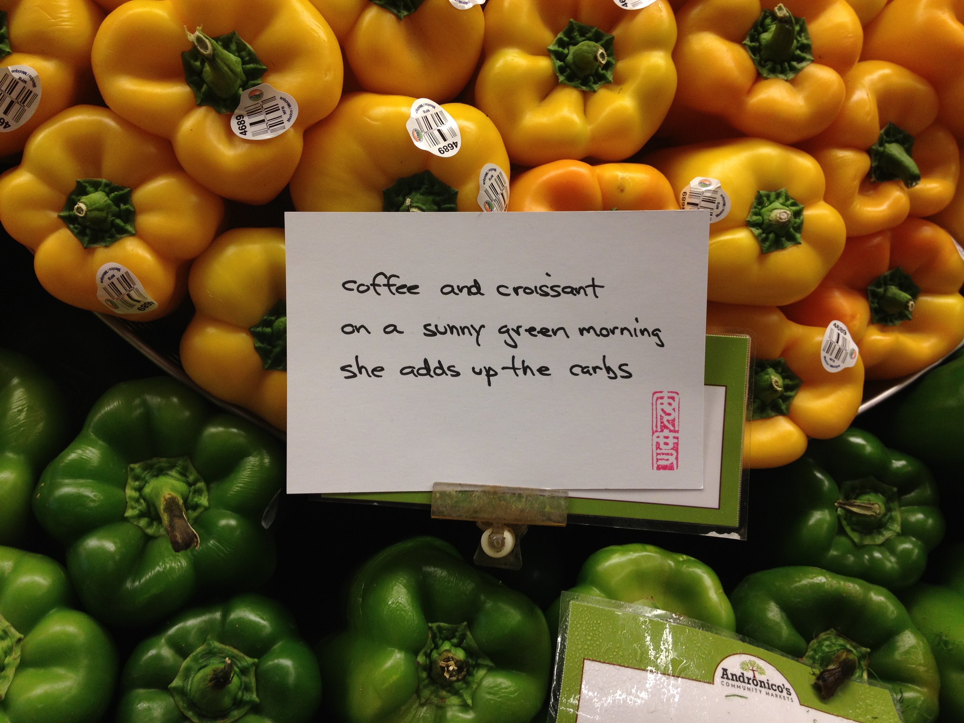 June 9, 2013 haikuandy haiku, micropoetry, san francisco, springtime Haiku 20130607 coffee and croissant on a sunny green morning she adds up the carbs