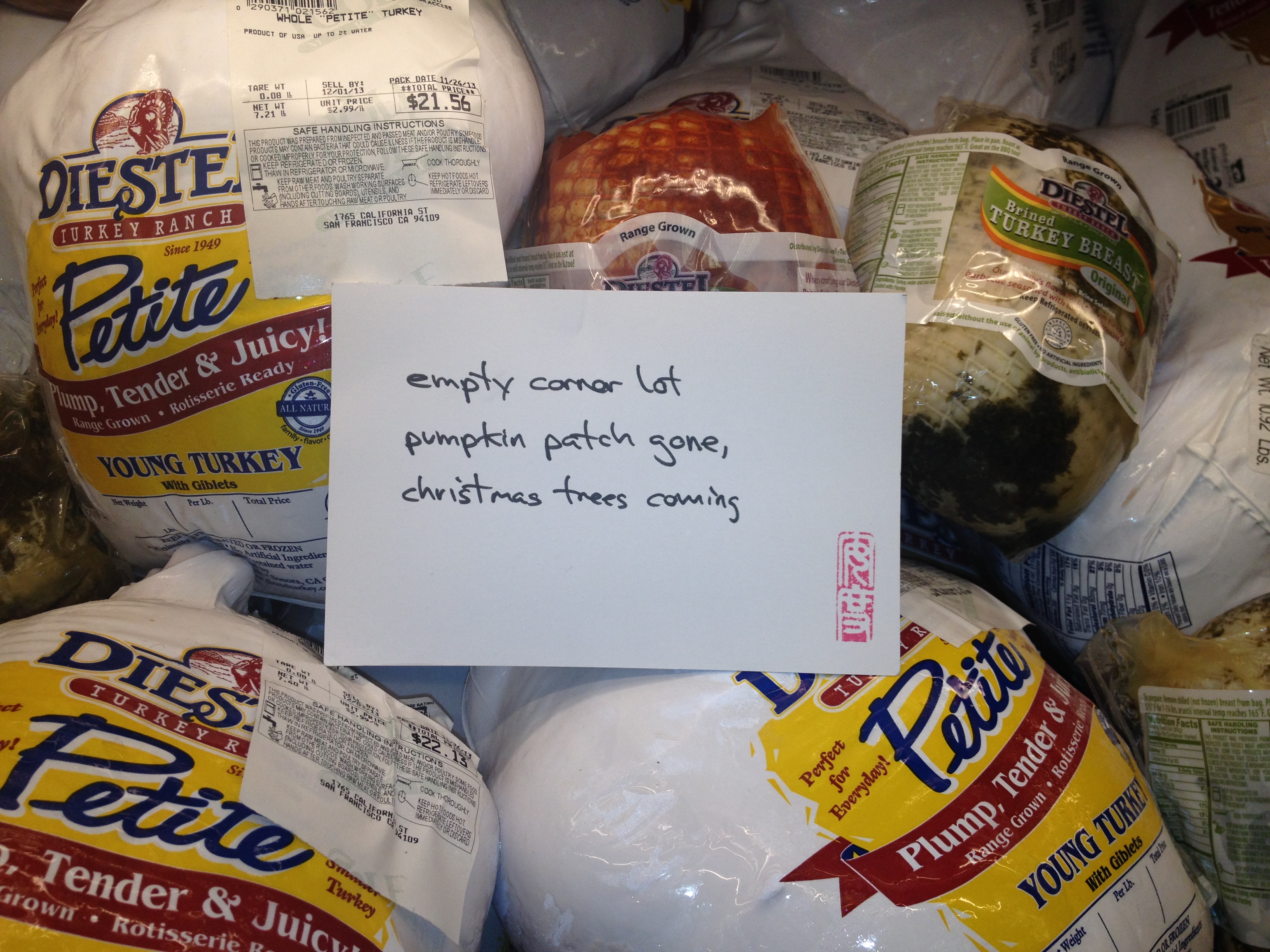 November 24, 2013 haikuandy autumn, haiku, micropoetry, poetry, san francisco, senryu, thanksgiving haiku 20131123 empty corner lot pumpkin patch gone, christmas trees coming