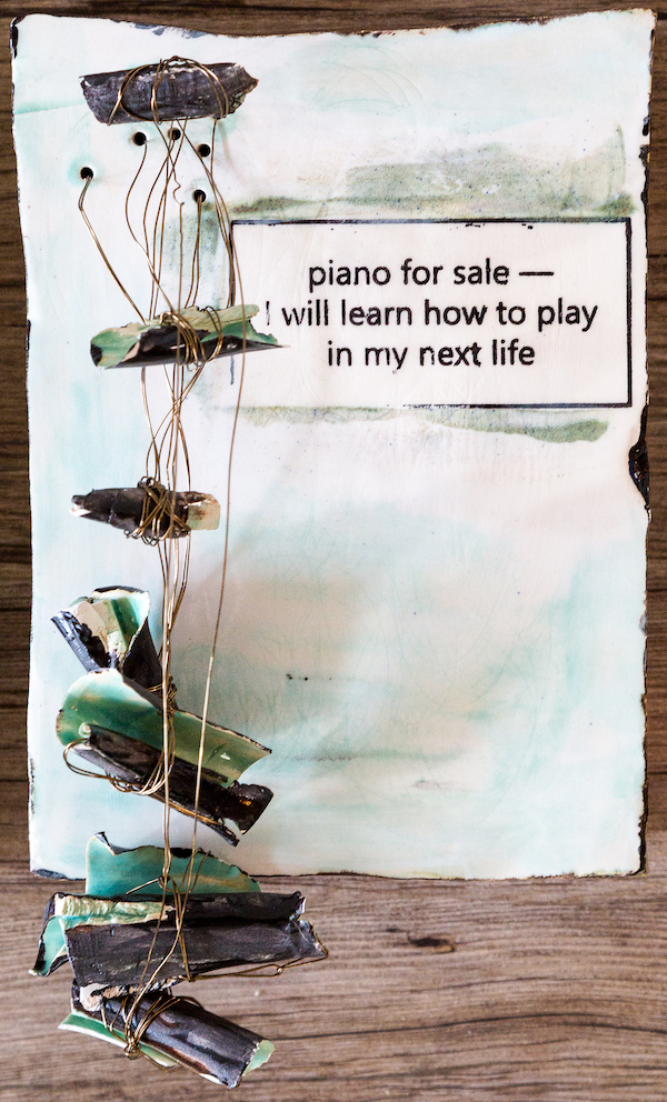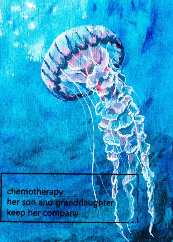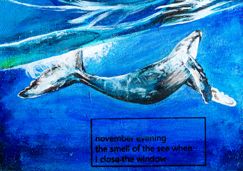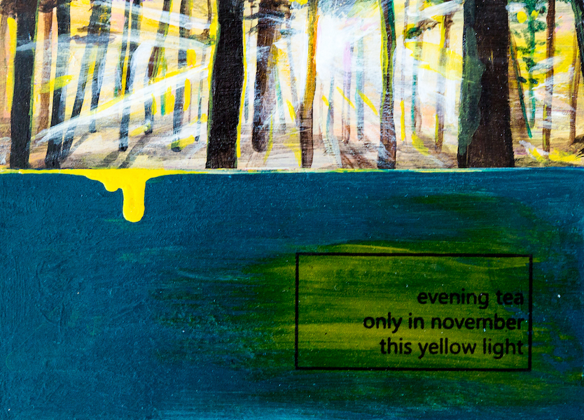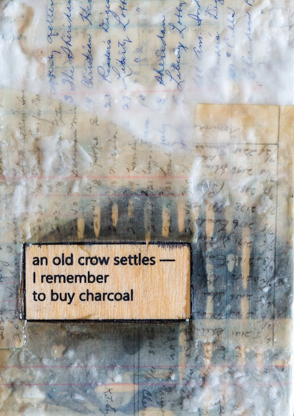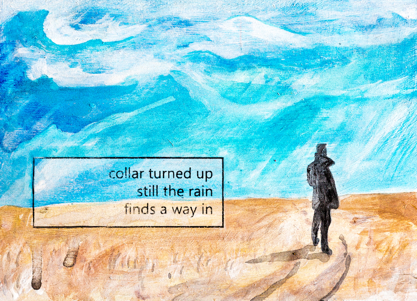 With Andrew’s direction and mentorship, Linds sent an original piece of artwork to a stranger every day in 2016. Last year they met for the first time in person and began collaboration on “HaigaGraph: A Haiku Art Collaboration”. Andrew wrote and sent Linds haiku that inspired the artwork. As a nod to their beginnings, all the small works are 5 by 7 inches, the size of a postcard.