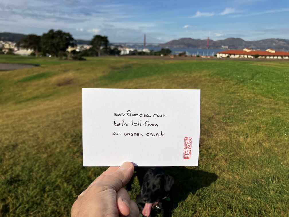 November 17, 2023 haikuandy haiga, haiku, micropoetry, poetry, san francisco haiku 20231117 san francisco rainbells toll froman unseen church