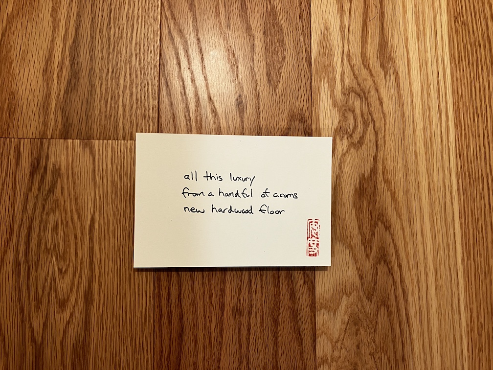 September 21, 2023 haikuandy haiga, haiku, micropoetry, poetry, postcard art haiku 20230921 all this luxuryfrom a handful of acornsnew hardwood floor