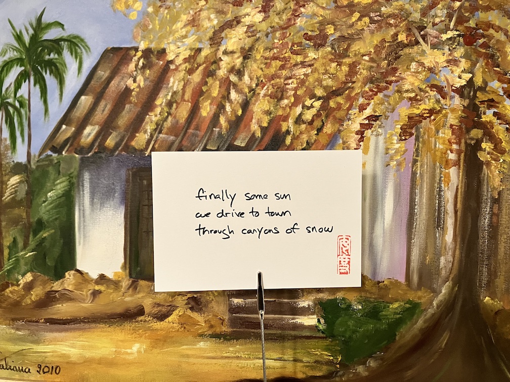 March 3, 2023 haikuandy daily haiku, haiga, haiku, micropoetry, poetry haiku 20230303 finally some sunwe drive to townthrough canyons of snow