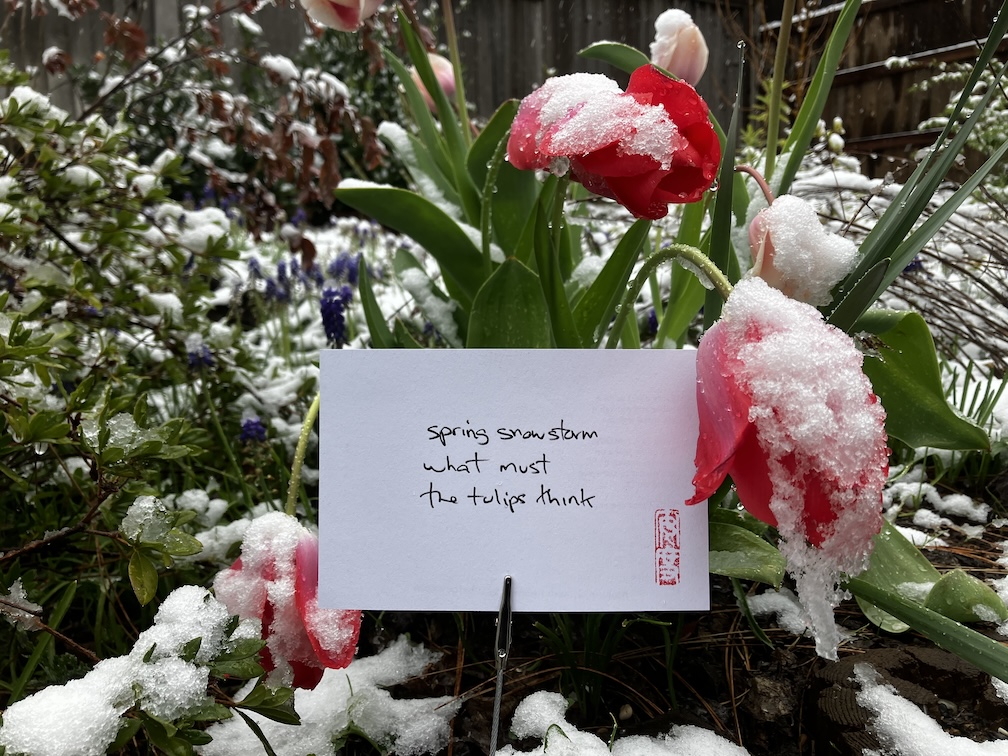 April 4, 2024 haikuandy haiga, haiku, micropoetry, poetry haiku 20240404 spring snowstormwhat mustthe tulips think